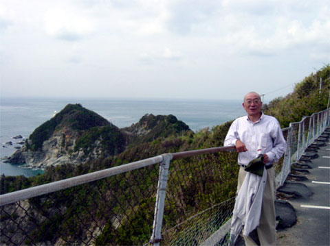 | この日、二つも法事が入り稼ぎ時の福田とも朝には別れ和島との二人きりになってしまった。 飛行機の出発までには6時間以上もの時間が余り、いっそのこと今治まで上ってレンタカーで「しまなみ街道」とばし龍の家まで行こうかとも考えたが、それには少し時間も足りず如何したものかと思案の末に四国最西端、日本一長い佐田岬の突端までのドライブを思いつき還暦男二人の旅の終わりは最西端の佐田岬灯台と決めた。(その意味はこれからも世のため人のために足元を照らす人生を過ごそうと) 佐田岬は半島の頂上のまるで刀のみねの様な国道197号線で八幡浜から40キロ、それなりに人家のある三崎港まで右の眼下に瀬戸内の海、左に宇和海を同時に眺めながらの運転は、時に思わず身の引き締まる思いがするほどかって経験したことの無い大自然の威厳を感じる。 岬の突端は三崎港からなお10数キロの細い道で、すれ違う車も人もまるで無く野鳥のさえずりだけが聞こえる物悲しくもエキサイティングなこの旅の終わりに相応しいところであった。 くねくねとした細い道を右に曲がると、そこは10数台の駐車スペースがある金網張りの駐車場でそれから先に道は無い。 あれれ・・灯台は何処に・・といぶかしがる我々の前によく日焼けした元気そうな老婆が近寄ってきた。 ・ ・・おばさん、灯台まではどうやって行くの・・・と尋ねると |