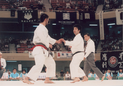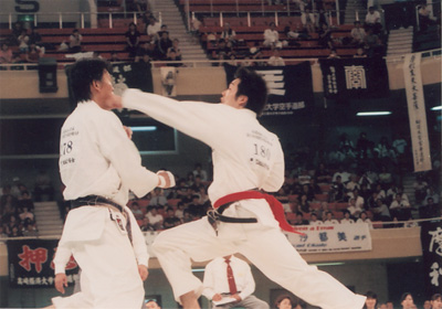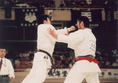 敢闘賞には形、組手に出場した44年卒 深沢 正選手が見事に獲得した。 深沢選手の戦い振りは賞賛に値するも、些か苦しげな写真はあえて載せる事を控えました。 |