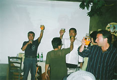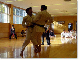 | 今大会には学生諸君はもちろん、チーム峻空会の選手諸拳も昨年の雪辱を晴らすべく気合を入れて稽古に励んでおります、少しでも多くの皆様の応援を力にして予選を勝ち抜き、選手諸君には残念ながら親睦会での酒を控えつつ明日の決勝に備えていただきたいと切望いたします。(酒如き恐れるに足りぬ、と言う豪傑はどんどんやりましょう) そして翌日にもう一度歓喜の杯を傾けなおしましょう。 |