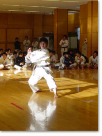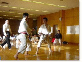 | 10時過ぎから行われた峻空杯争奪戦は男女総合の形試合、男子組手、女子組手の三部門で行われ、どの部門もまるで全国大会を観るような高いレベルで白熱した試合が繰り広げられた。 | |||