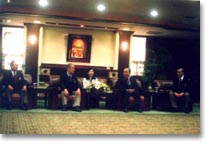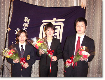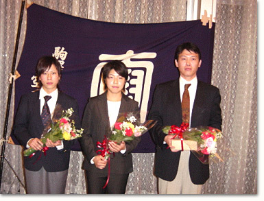 | 大会終了後、会場を深沢校舎内の大広間に移しての本年度、個人戦優勝者の栄光を称えて祝勝会が行われました。 本年度栄光に輝いた者は7月に行われた「第47回 全国選手権大会」に於いて男子組手、形、総合優勝の平成元年 小林邦雄君。 同大会女子組手優勝、現1年生 若林梨沙君。 9月に行われました「第9回 松涛杯争奪世界空手道選手権大会」女子組手優勝 平成15年奥家沙都美君の三名でした。 祝勝会には40名近いOB,OGが出席し、盛大なかに選手諸君の頑張りを称え楽しい時を過ごしました。 |