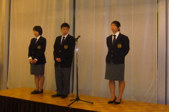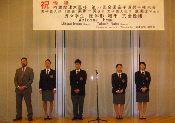 祝勝会も終盤、各学年ごとに部員登壇。各自で氏名、学部を紹介し終えた後、事務局長より「11月16日(日)全日本大学選手権大会(日本武道館)、応援宜しくお願いします。」及び「峻空杯争奪戦及び幹部交代式は11月30日から23日(日)に変更になりましたのでご注意下さい。多くさんのOB・OG皆様方とまたまた楽しい時間を過ごしましょう。」との連絡。