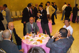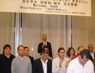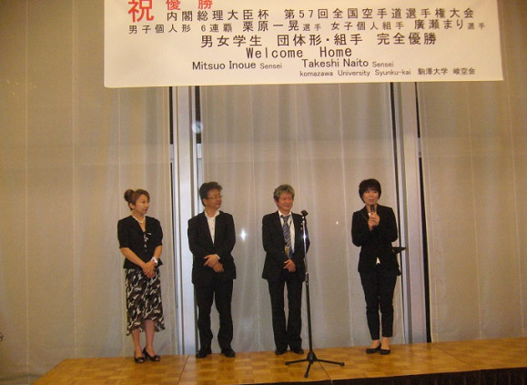 前日の世界大会を終えて、空手道海外普及に30年以上もの長年に亘って尽力されおられる井上光雄・内藤武史指導員及び南アメリカから20数名もの仲間も参加されました。また、OB・OG、現役部員、御家族、父母会からもそして桑田禮彰駒澤大学副学長のご出席を頂き120名を超える賑やかな祝勝会となりました。