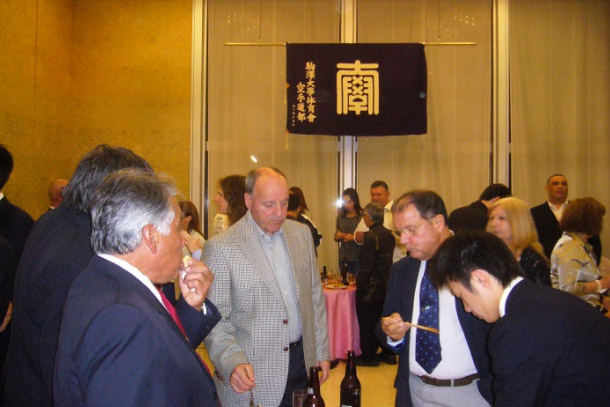 両名の大先輩へは赤木会長より長年の空手道海外普及指導に敬意を表して記念品贈呈。(ちなみに中身は会長の地元山梨県の特産品―印傳の巾着袋です)