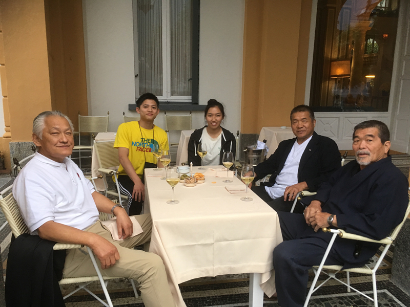 6月7日(金) 午前中、3人でミラノのドォーモに行き、午後に合宿地のマリアーノコメンセ市まで移動。ホテルには、日本以外にイタリア、スペイン、フランス、マルタ、チリ、パラグアイ、アルゼンチン、ブラジルから15歳〜25歳の選手が集まっており、大変賑やかだった。ホテルでアルゼンチンの井上先輩ともお会いし、駒大5名とブラジルの町田先生とコモ湖近くのホテルでシャンパンを飲んだ後、日本料理「寿司 さくら」で食事をする。 |