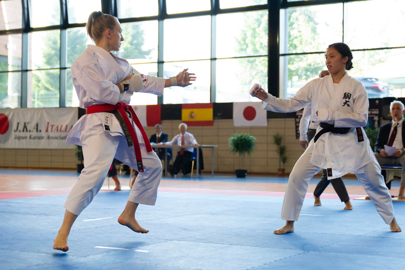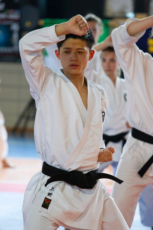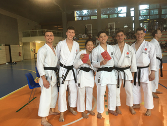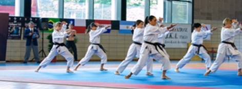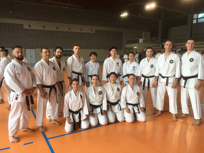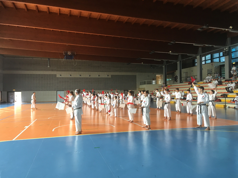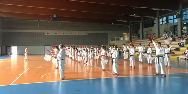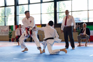 6月8日(土) セミナー・親善試合 体育館には選手以外にイタリアの空手関係者が大勢集まっており、9:00〜11:00、15:00〜17:00まで3クラス(三段以上、三段以下、無段者)に分かれ技術セミナーが行われた。セミナーの前にイタリアの空手関係者が年齢を問わず審判の講習を行っていた。小さな子どもも審判の練習をしている姿は日本ではまず見ない光景だ。内藤先輩曰く「年齢の枠に囚われず、誰にでもチャンスを与えている。上手な子がいたら、小さな子どもでも審判をやってもらう」との事。そのような光景を目にすることができてよかった。