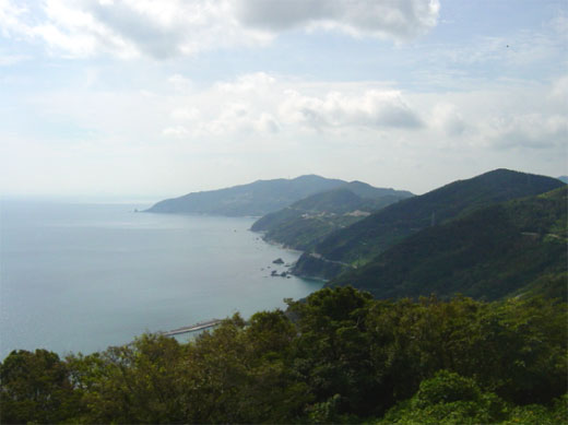 | ・・・気をつけてな〜 おばちゃん此処でまっとるからな〜・・・ 妙な言葉を後ろから聴きながら20分も下っただろうか、私はふとえらい事に気がついてしまった。 ・・・まてよ、まだ半分も来てないのにひたすら下っているが、もしや帰りはこれを登るのか? リフトも無ければタクシーも来ない、これはえらい事になるぞ・・・・ 案の定しばらく行くとかなり年配の夫婦のお遍路さんと唯一すれ違ったが、旦那の顔を見ると息も絶え絶えに登ってくる、これが1時間後の自分の姿かと想像すると恐怖すら覚えた。 それでもようやくの事で先端までたどり着くと、そこにはこれまでの疲れや不安を一掃させるほどの大パノラマが眼下に開けた。 |