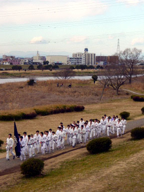 年々参加者の数も増し大勢のOB,OG、そして次世代の駒大空手部を担うだろう子供たちも加わって盛大に行われた今年の総持寺行軍。 当日は、快晴とまではいかなかったものの天候にも恵まれ、10時ちょうどに駒沢公園正門前をスタートした一行はかなりのハイペースで進み、例年のようなガス橋での小休止も取らぬまま一気に駆け抜る勢いは今年の活躍振りを暗示するかのような意気込みを感じさせてくれた。 |